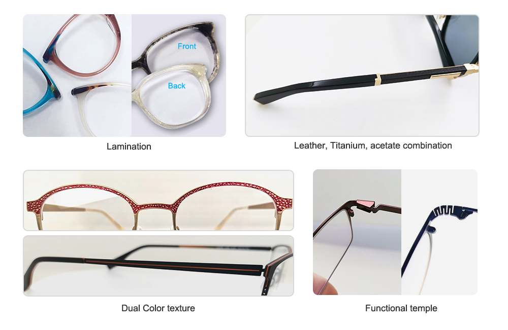 Lamination, different material combination, dual color texture plating, functional temples are all available. Welcome any