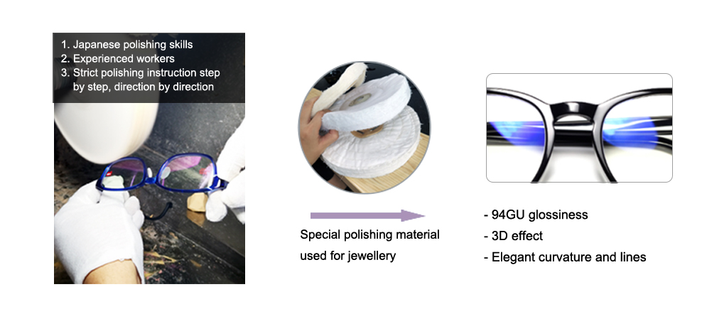 With all these effort, AFALO acetate eyewear can reach 94GU glossiness as mirror, also can realize special 3D effect and